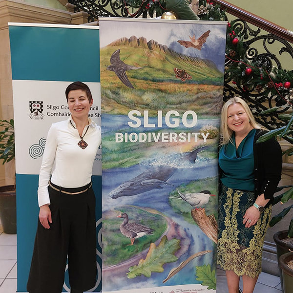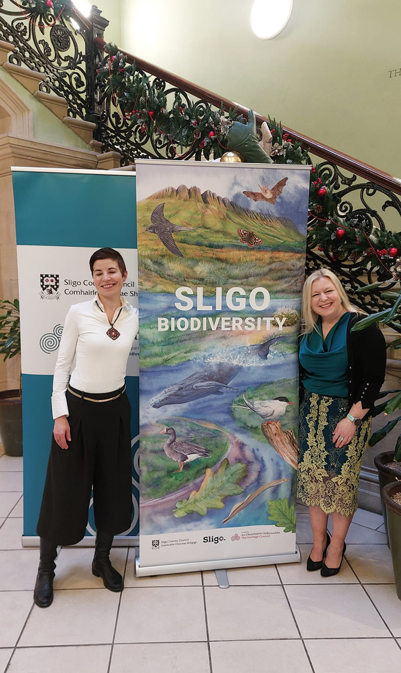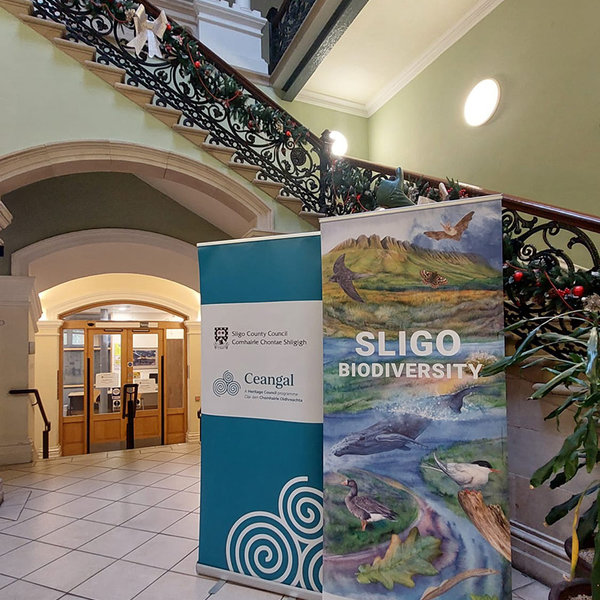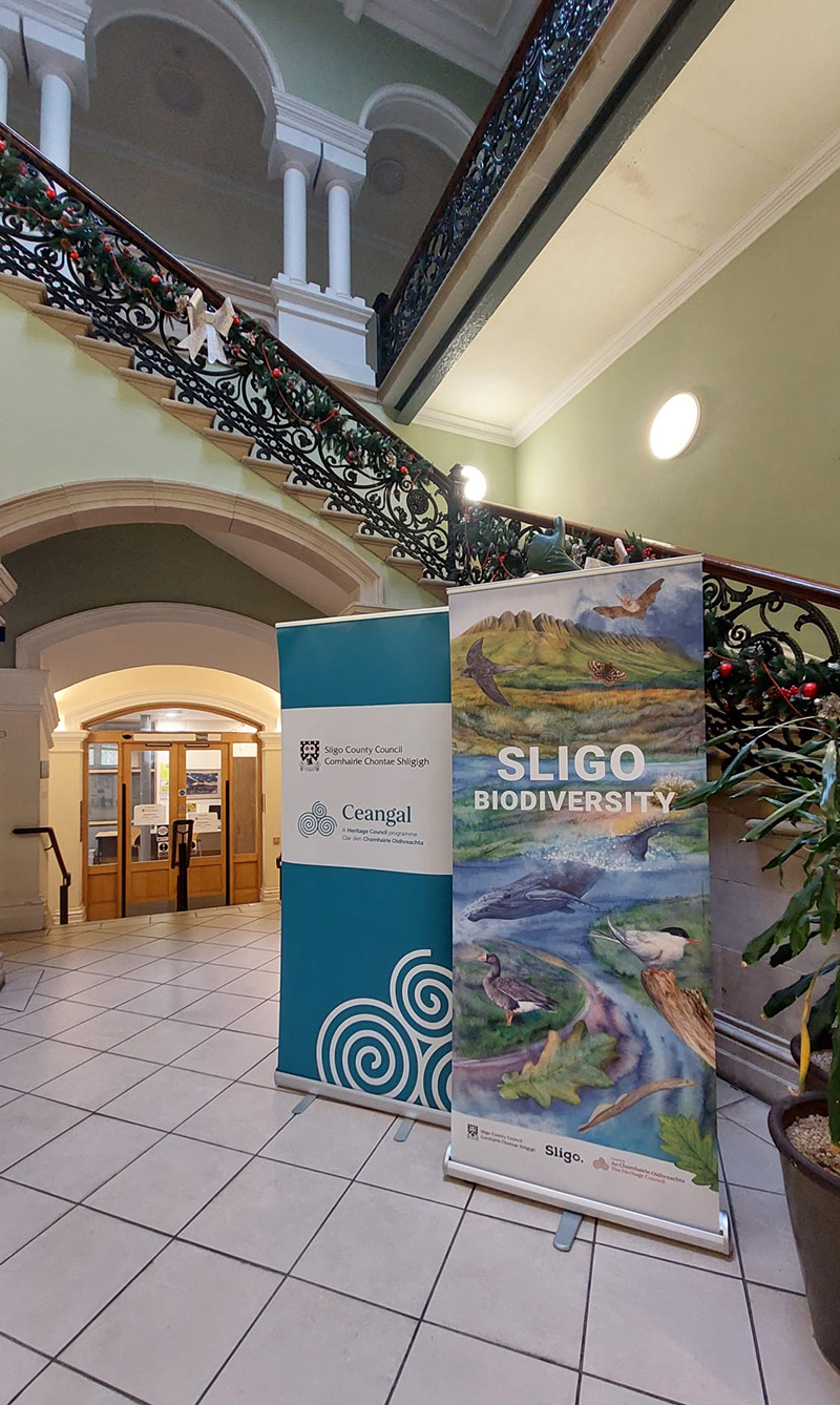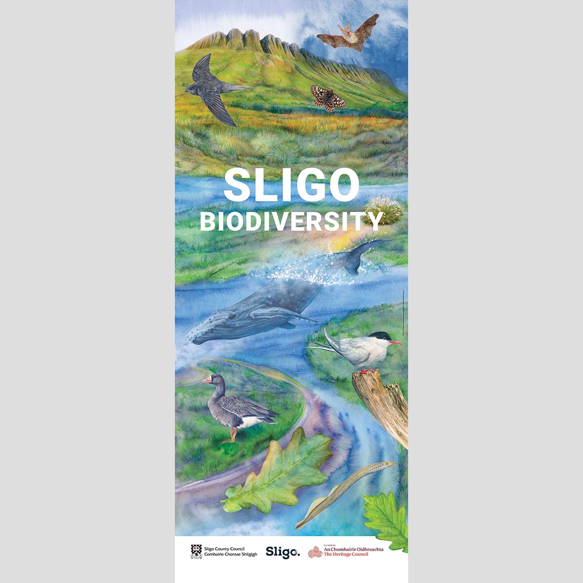 The wildlife art used for the banner includes the famous Sligo's landmark – Benbulben mountain, a brown long-eared bat, a marsh fritillary butterfly, a swift, a humpback whale, an Arctic tern, a Greenland white-fronted goose, a lamprey, grasslands and oak leaves.
